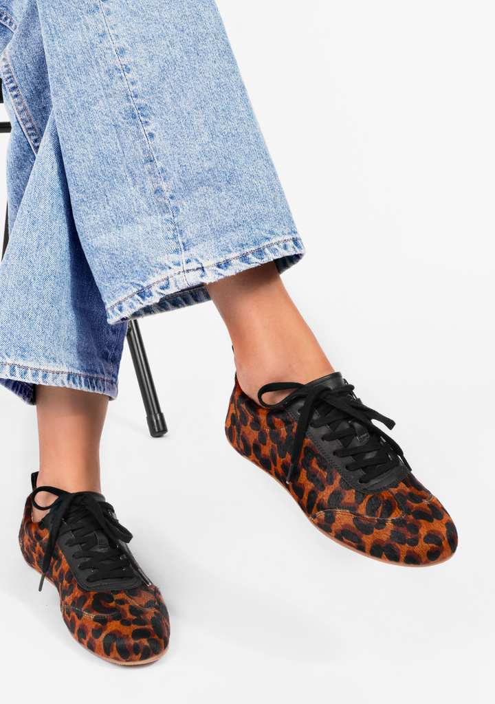 Esta zapatilla de cuero con print animal combina textura, estilo y comodidad.