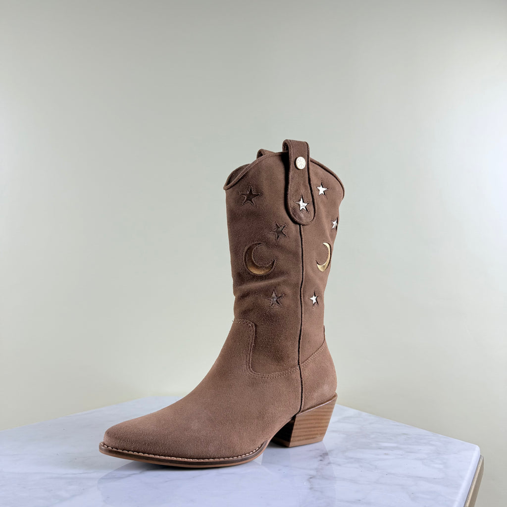 Estas botas en suave cuero camel destacan por sus bordados dorados de lunas y estrellas, un detalle que ilumina cualquier look sin perder la elegancia.