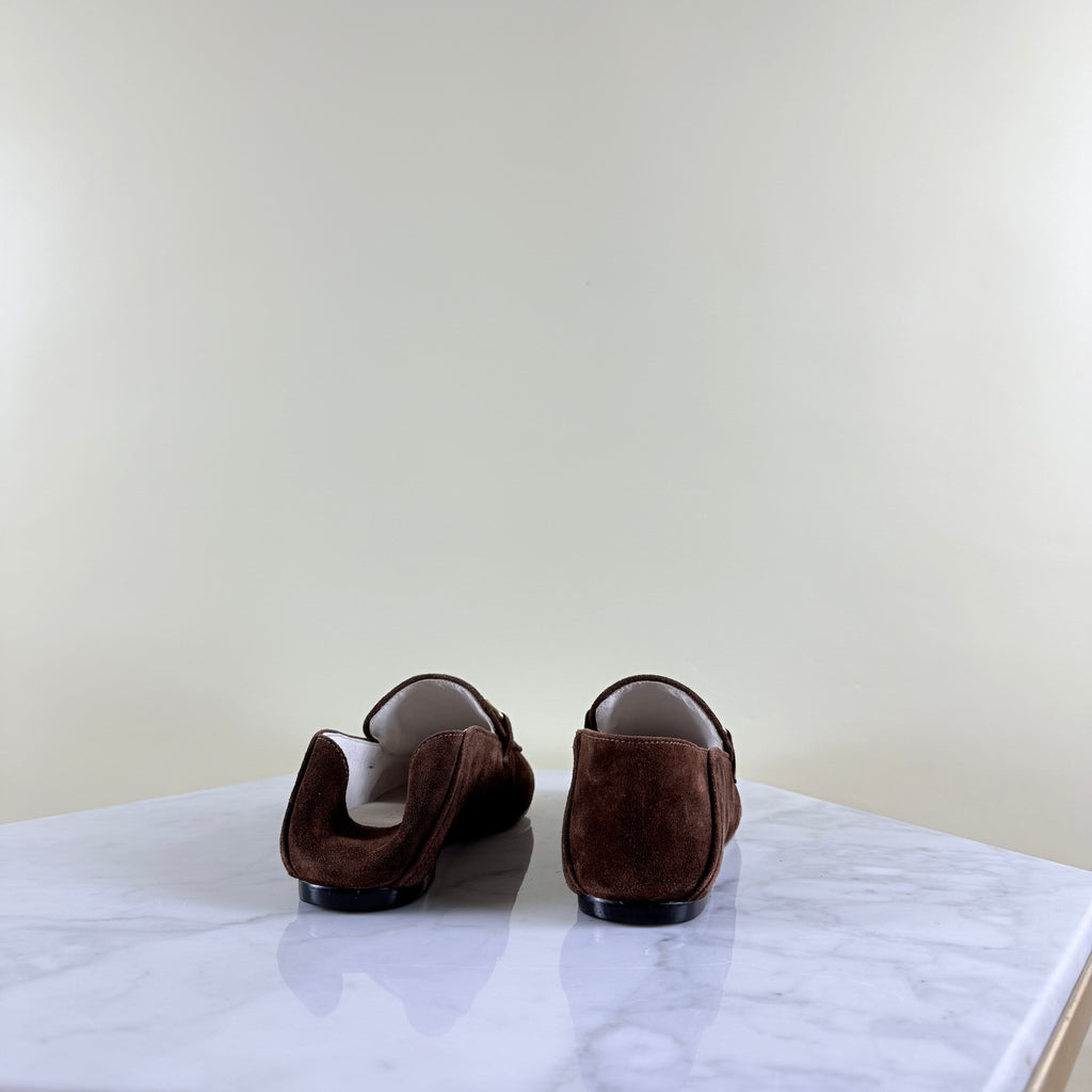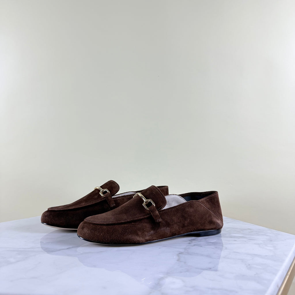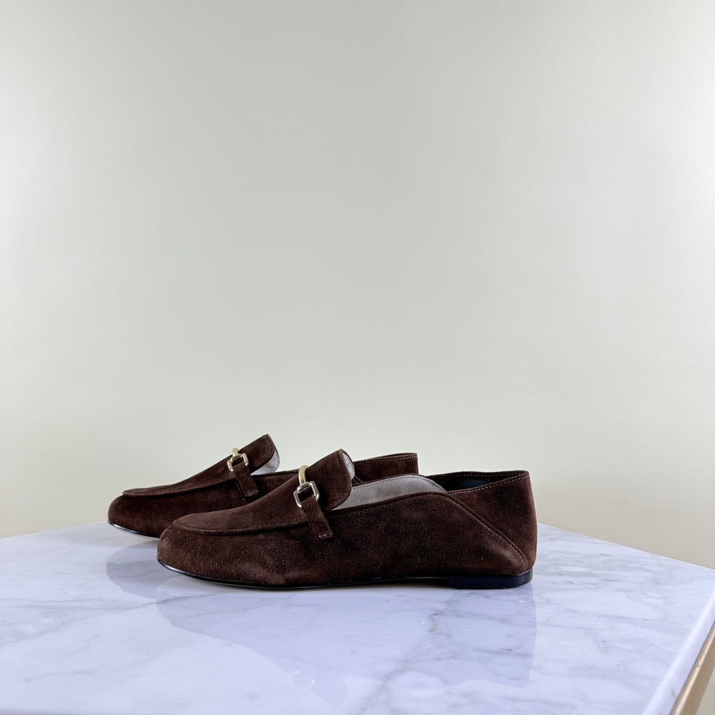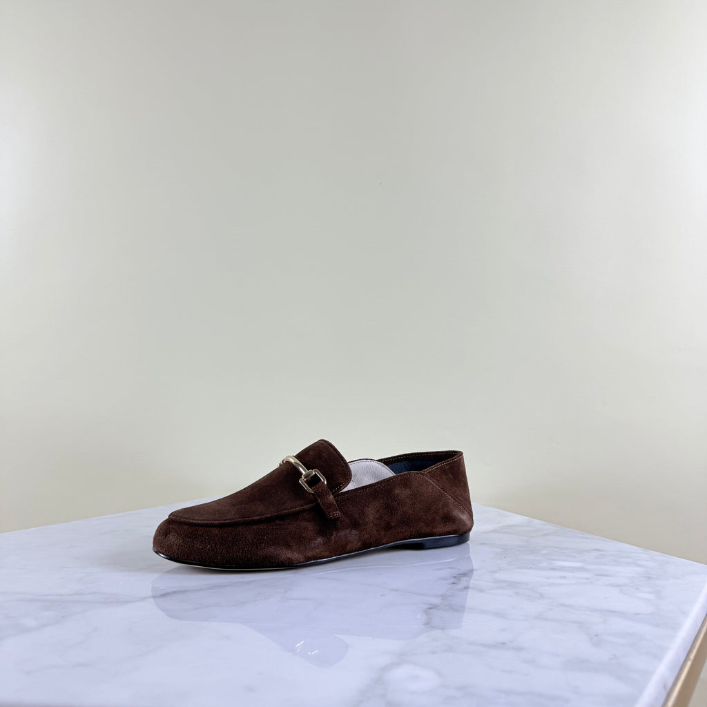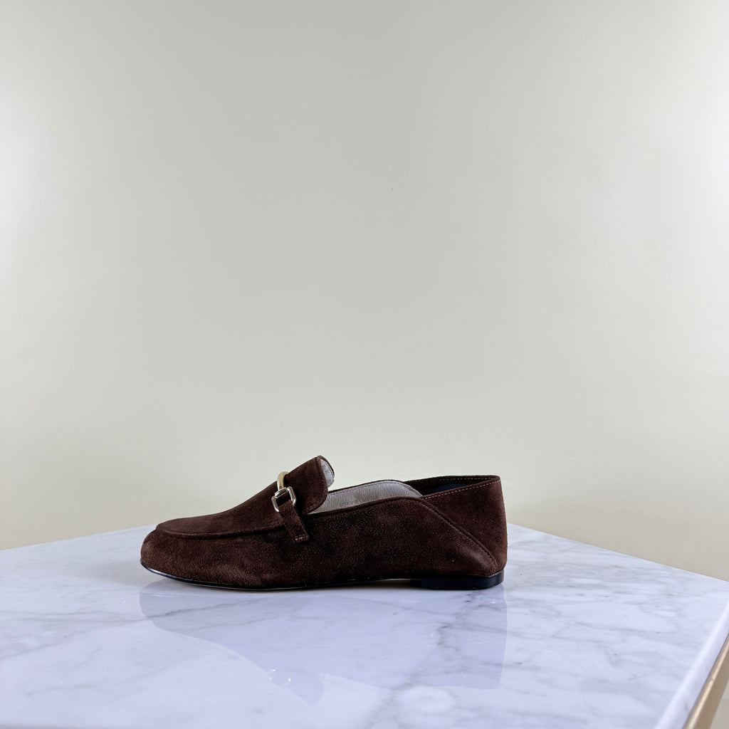 Un clásico refinado que nunca pasa de moda. Este mocasín de cuero gamuzado combina una silueta depurada con una hebilla dorada que aporta un toque de elegancia sutil.