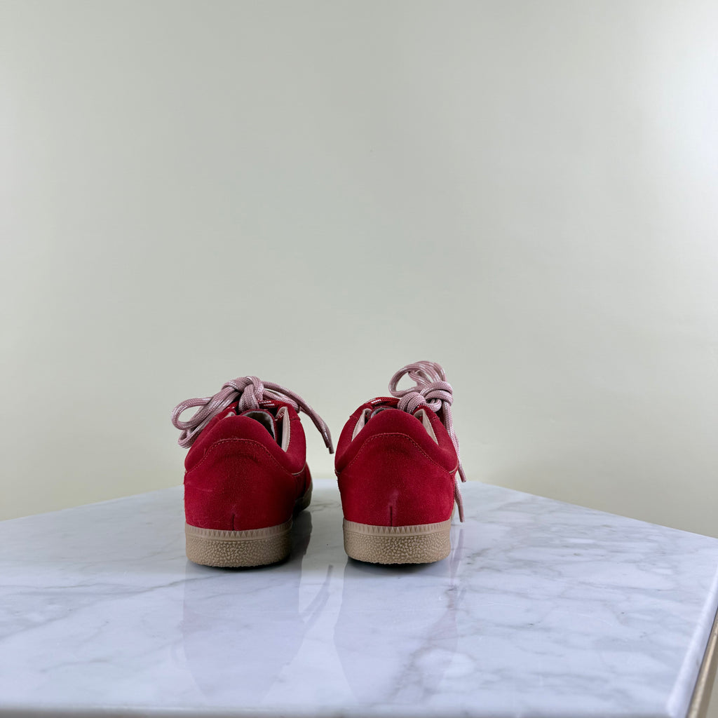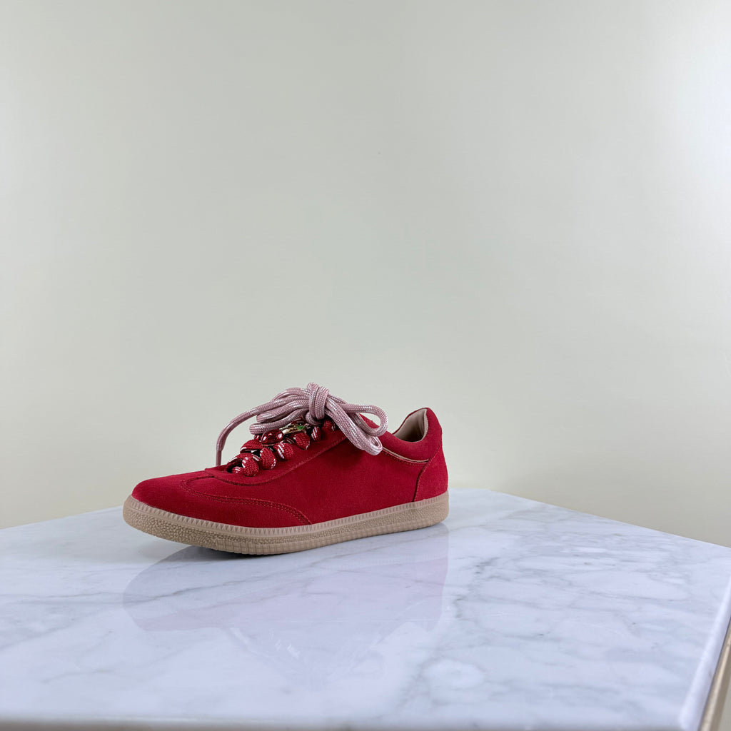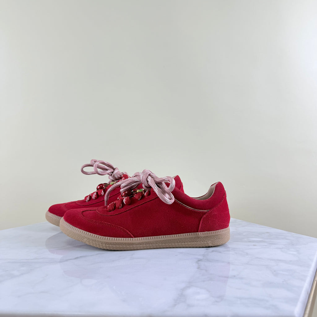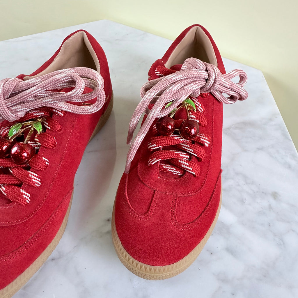 El rojo vibrante en gamuza se roba todas las miradas, mientras los cordones bicolor y el charm de cerezas le dan una actitud de frescura.