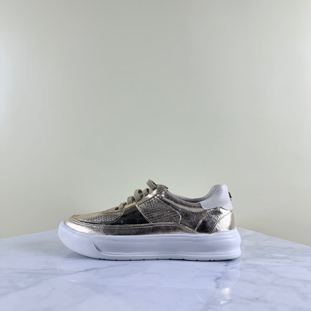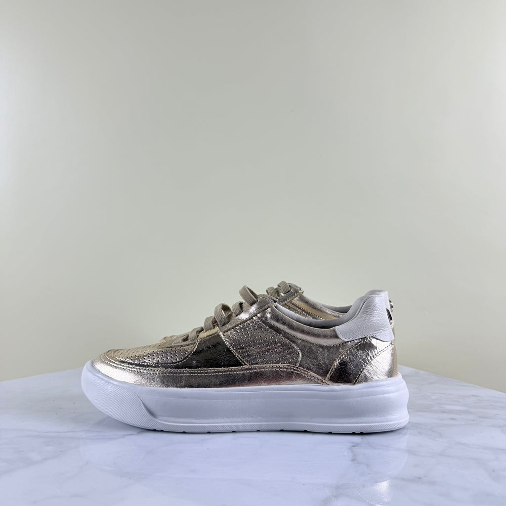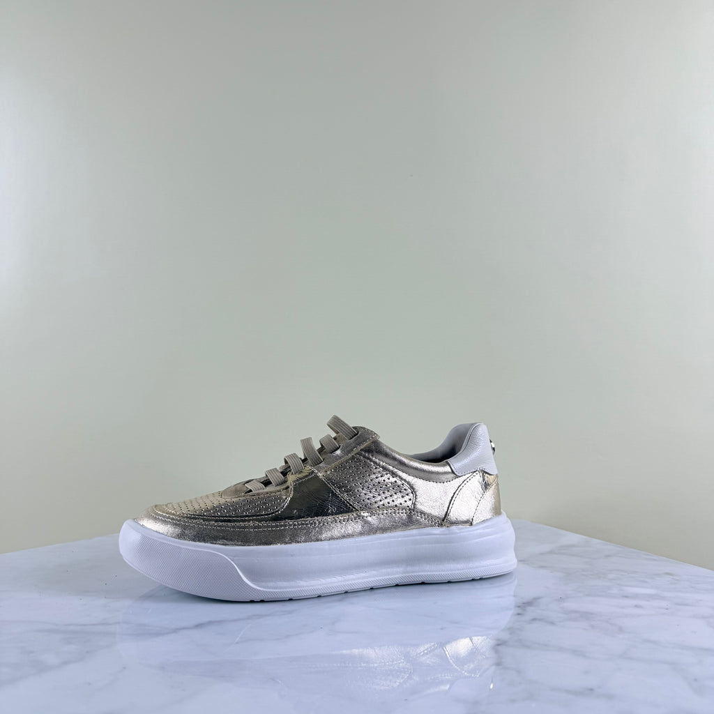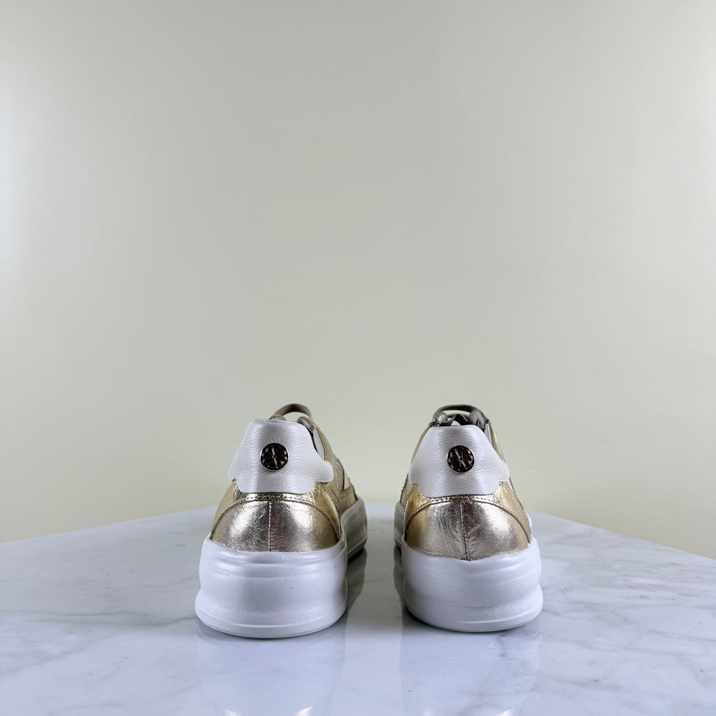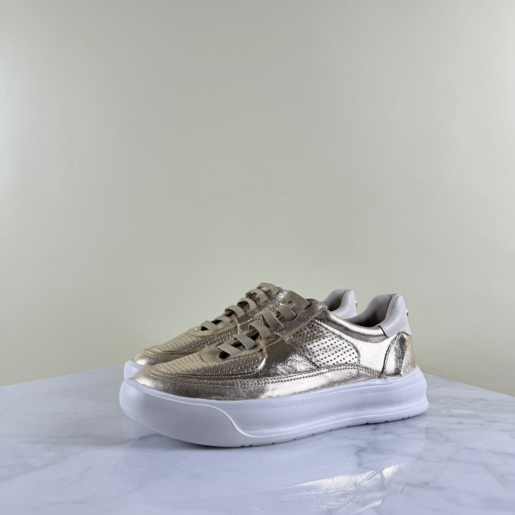Estas zapatillas de cuero —suaves, perforadas y con textura— combinan una base impecable con un detalle combinado en el talón que aporta luz.