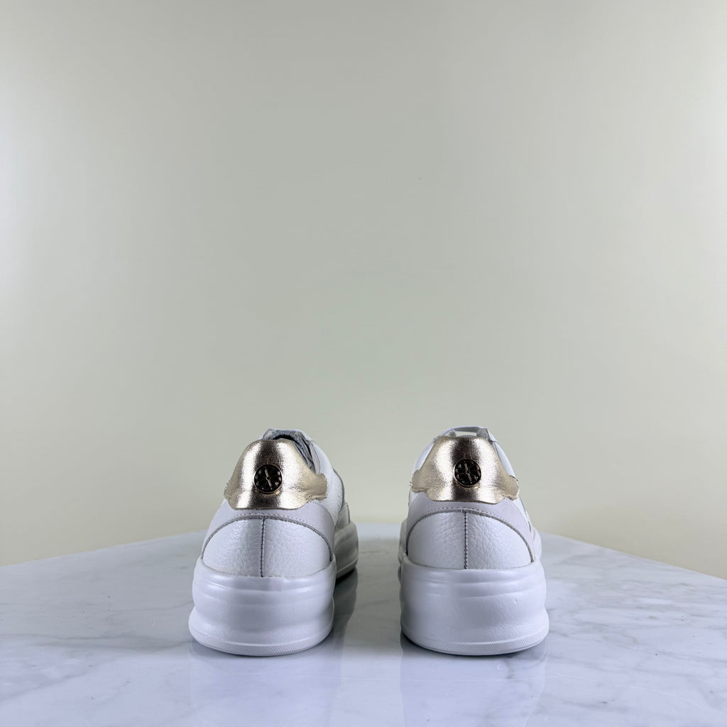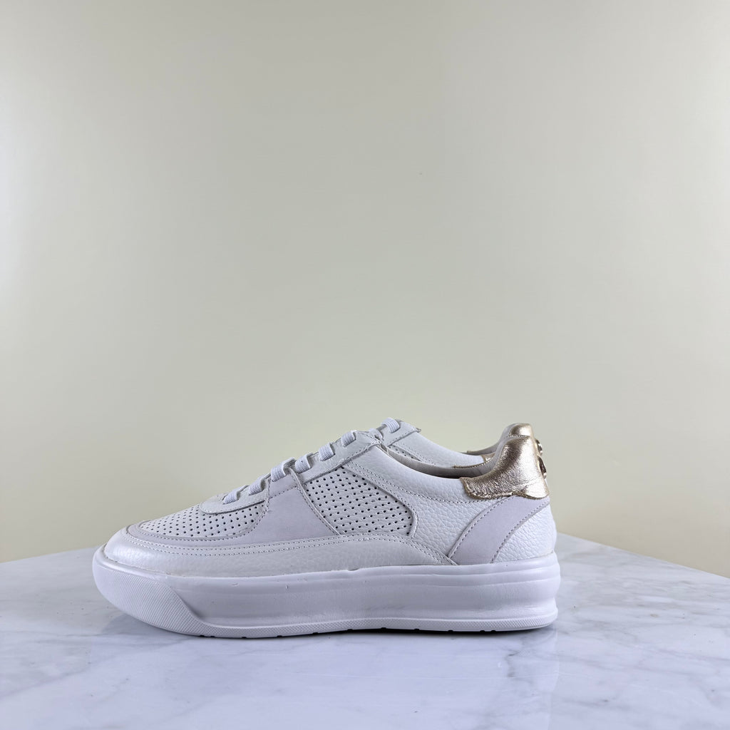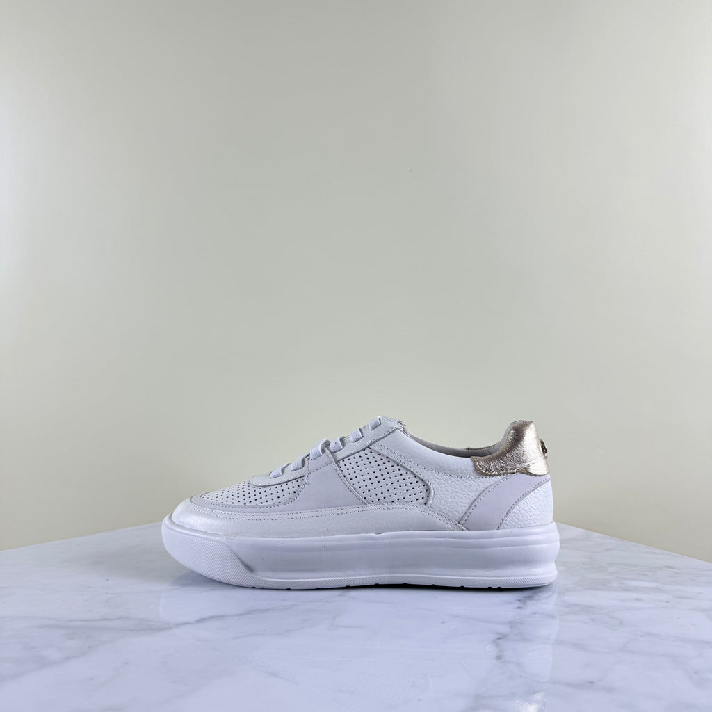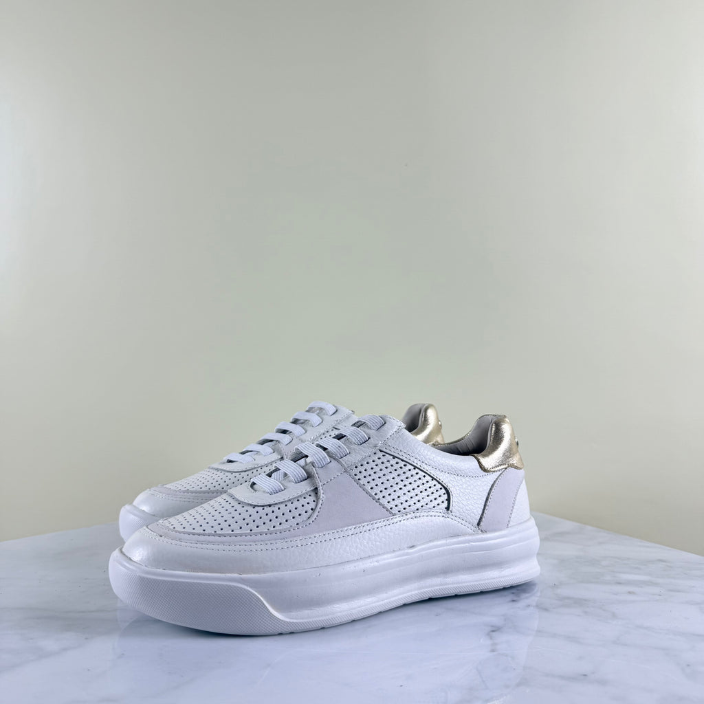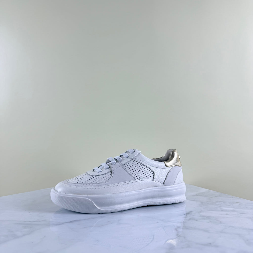 Estas zapatillas de cuero —suaves, perforadas y con textura— combinan una base impecable con un detalle combinado en el talón que aporta luz.