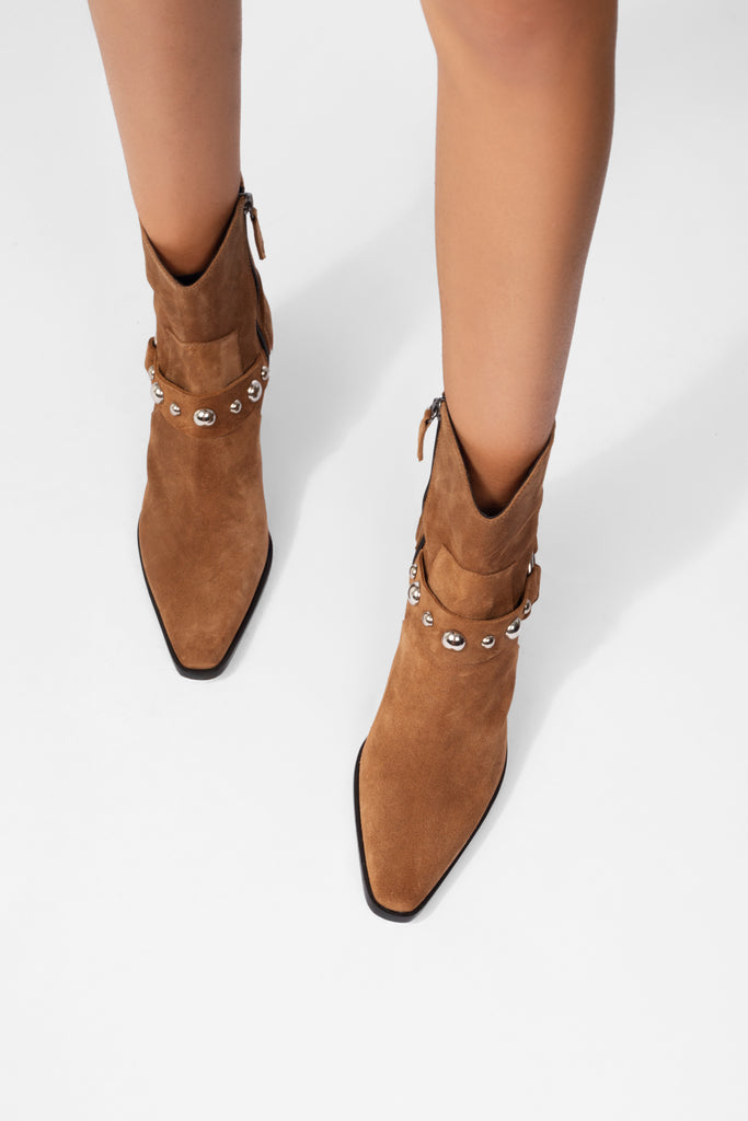 Hecha en cuero gamuzado y con detalles de tachas y argolla que le dan un upgrade perfecto.