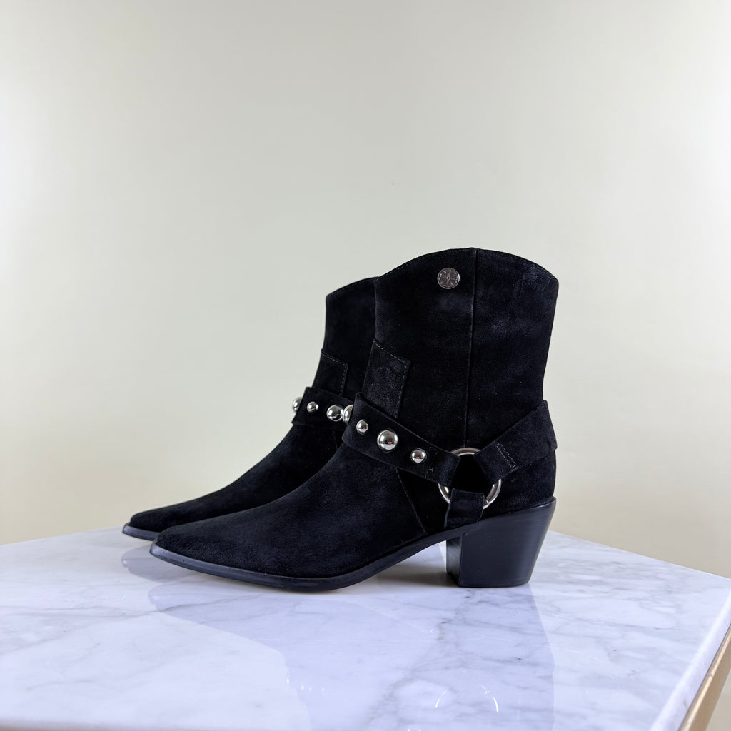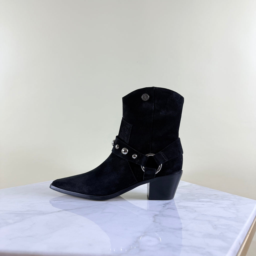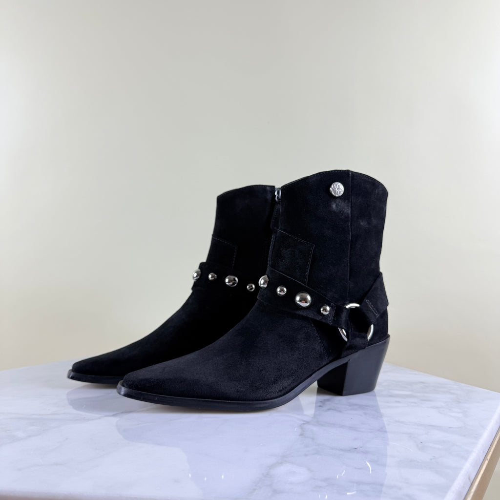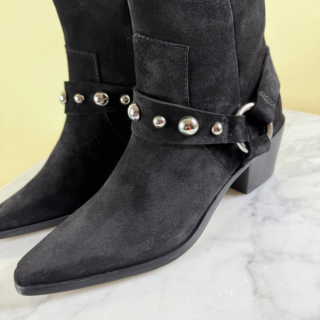 Hecha en cuero gamuzado y con detalles de tachas y argolla que le dan un upgrade perfecto