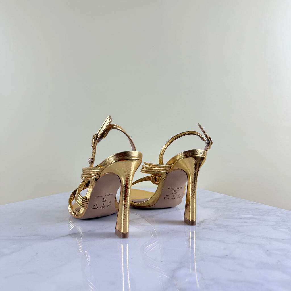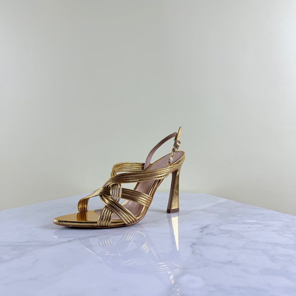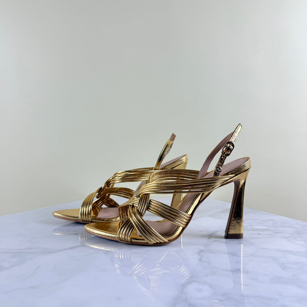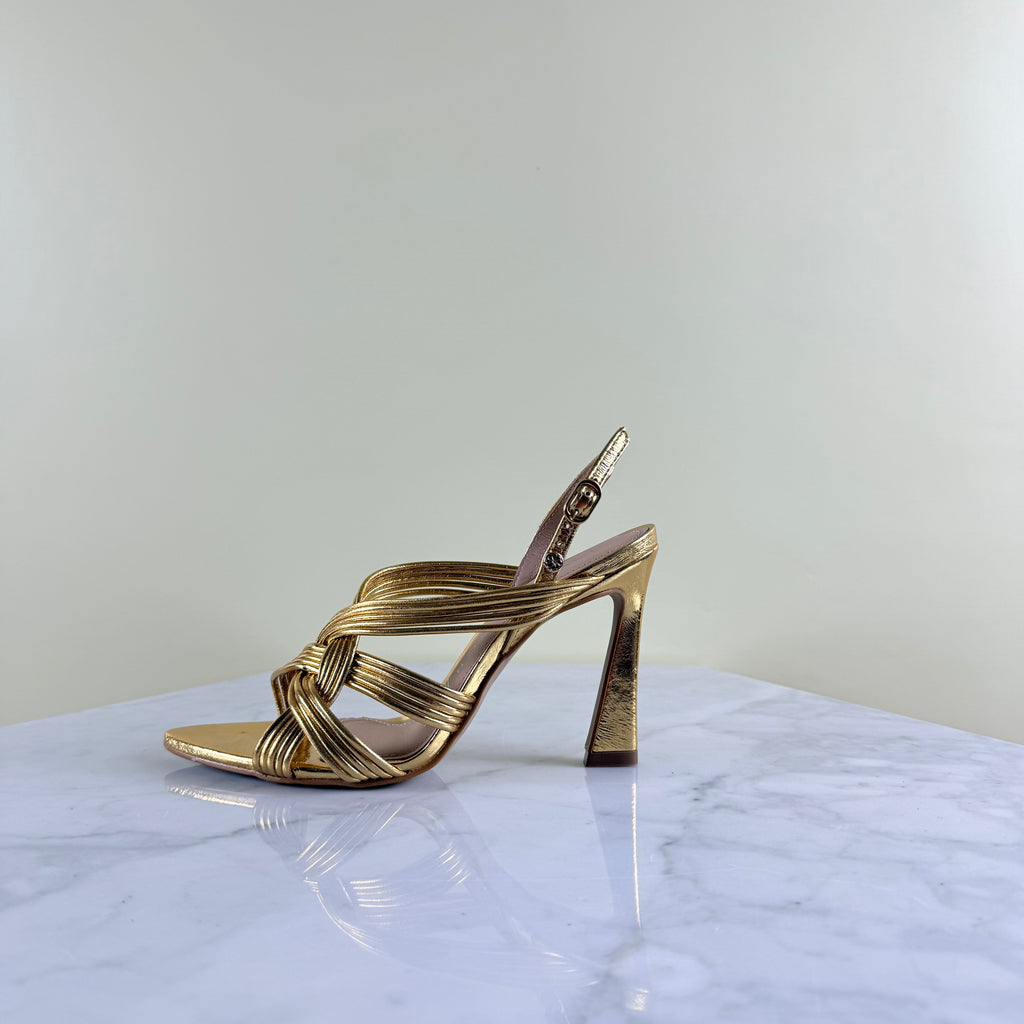 Su diseño en cuero con acabado metalizado y tiras entrelazadas crea un efecto delicado y sofisticado, mientras el taco alto estiliza con seguridad.