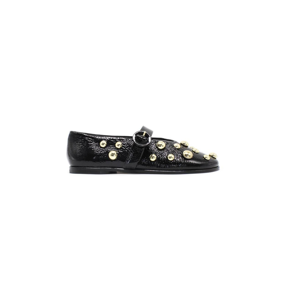 Esta bailarina de charol negro está cubierta de tachas doradas que la hacen imposible de olvidar.