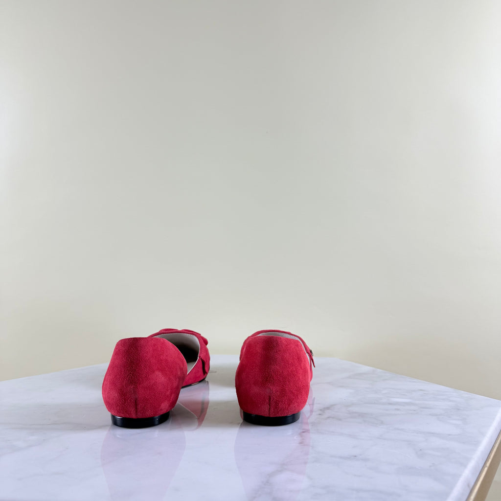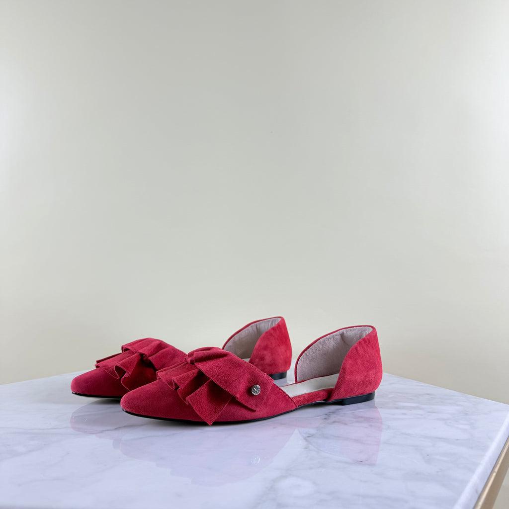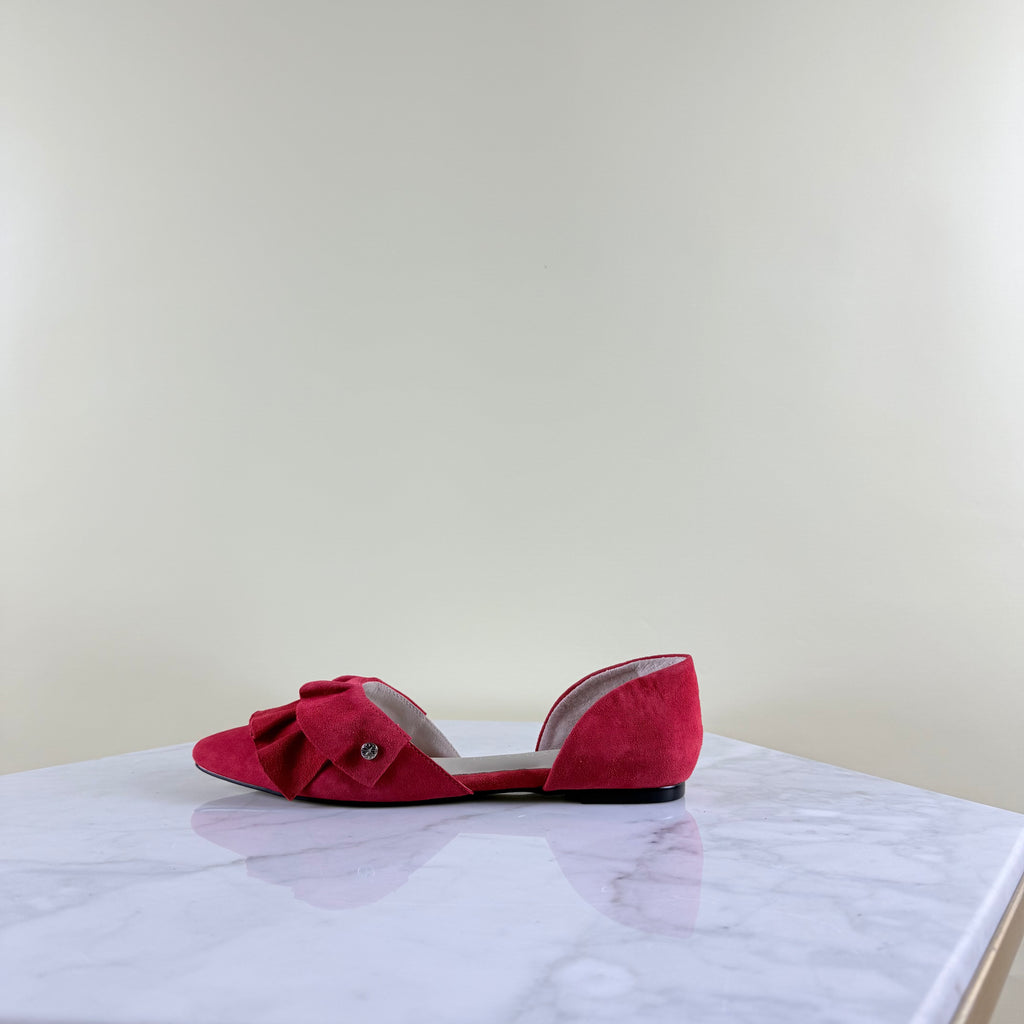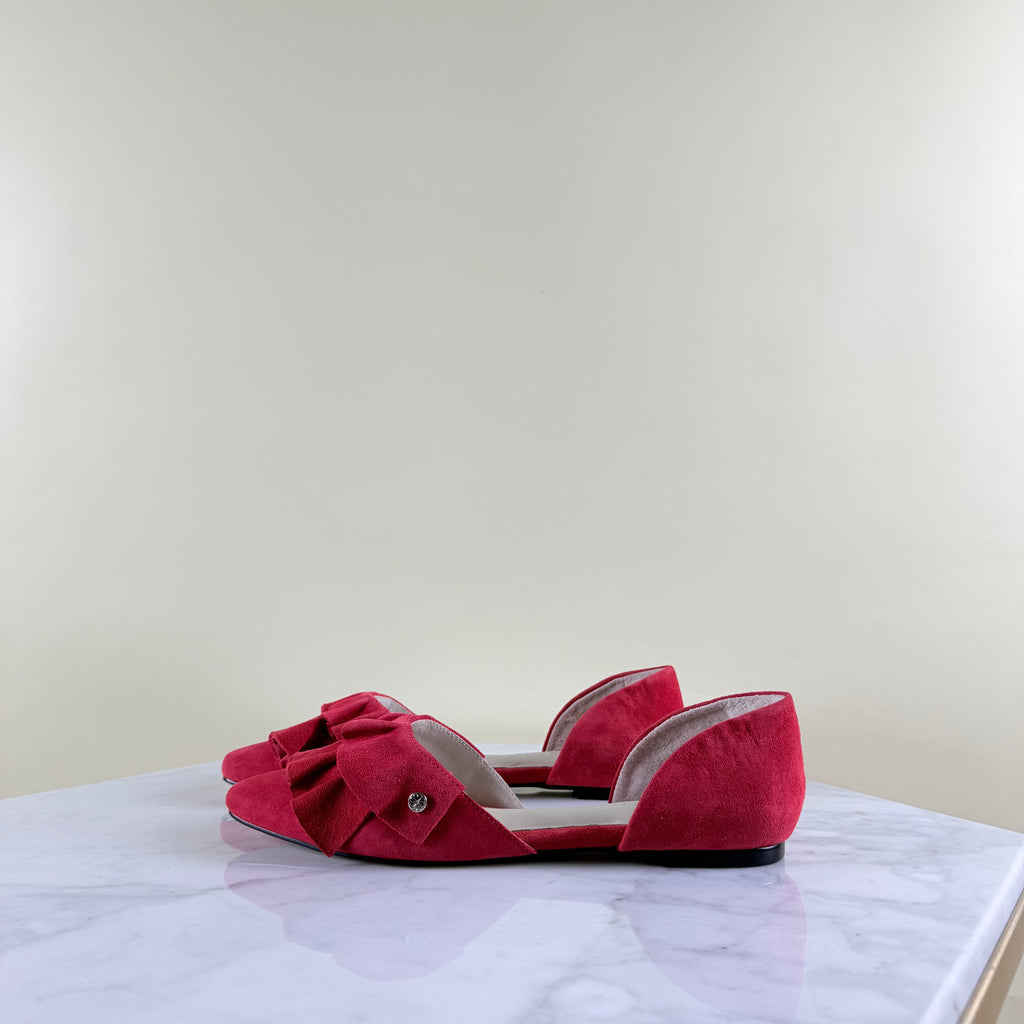 Este zapato rojo de cuero gamuzado, punta afilada y volantes, es una maravilla.